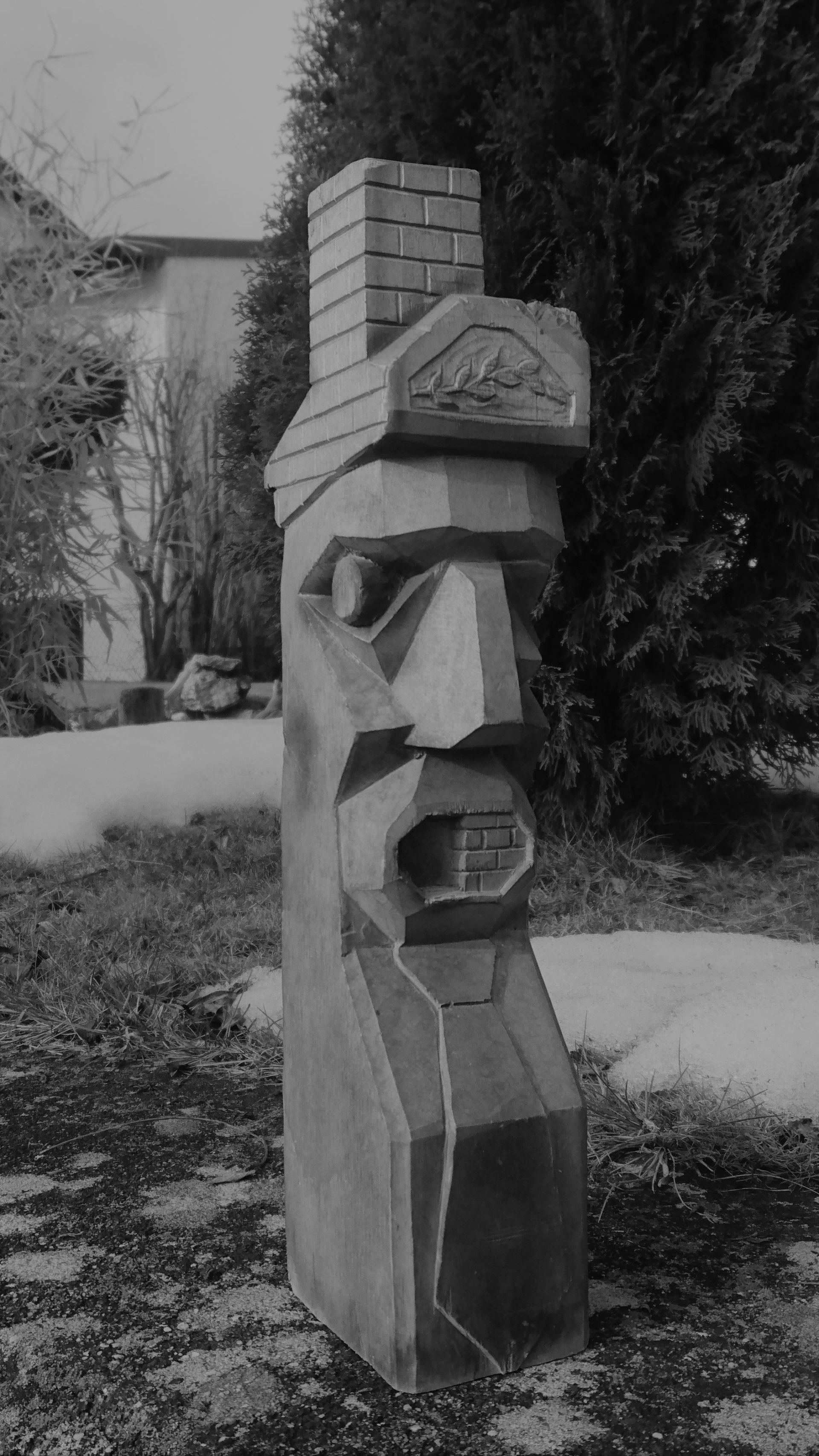 Bild links: Die Skulptur trägt die Gesichtszüge des Diktators Ceausescu, mit der karakteristischen Mütze auf dem Kopf, die hier als Fassade dargestellt wird, geschmückt mit den Lorbeeren der kommunistischen Propaganda.Das Auge wie eine Überwachungskamera,der Mund einerseits weit geöffnet für die Versprechungen von einer besseren Welt durch das Kommunismus, anderseits der eingemauerter Mund des Volkes.